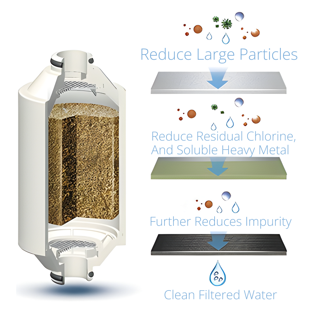 Patented Copper-Zinc (KDF) media filtration further reduces chlorine and prohibits bacteria and algae growth.